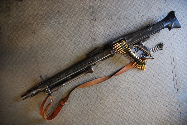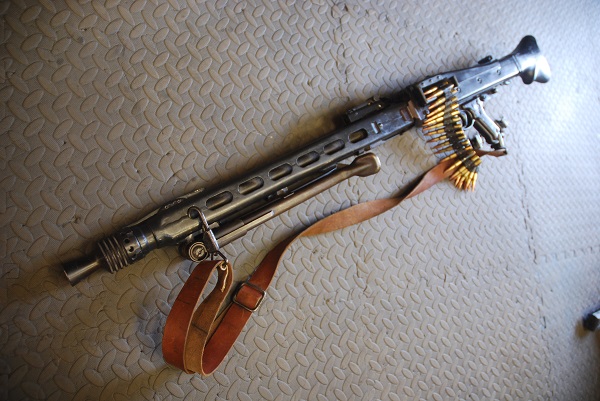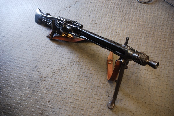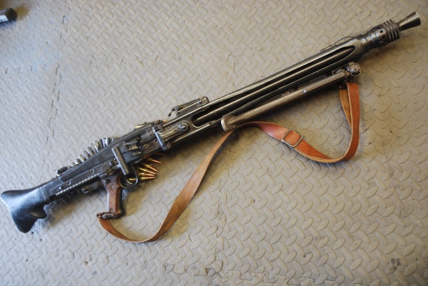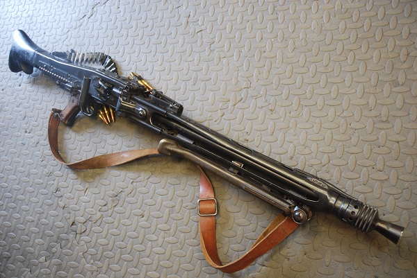 Deactivated MG53 machine gun, cocks and dry fires with belted ammo and sling, WW2 German barrel: